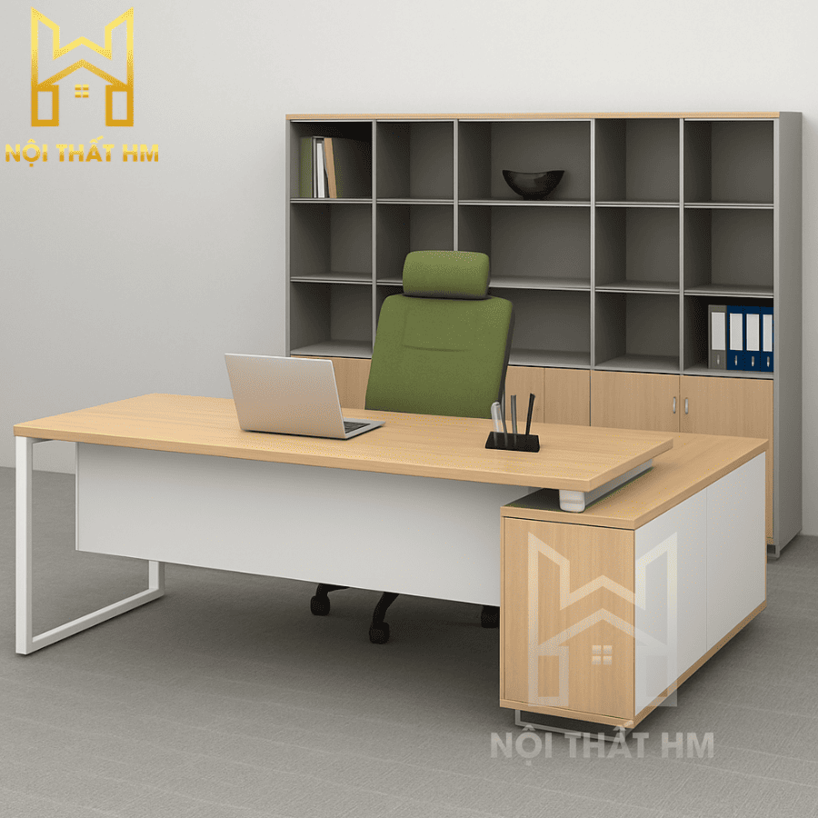 Tông màu vàng của vân gỗ phối cùng màu trắng tinh khôi của khung chân và một phần tủ phụ giúp xóa tan vẻ nặng nề của các dòng bàn lãnh đạo cũ. Gam màu này đặc biệt phù hợp để khơi gợi cảm hứng sáng tạo và tạo thiện cảm trong các cuộc giao tiếp với đối tác.
