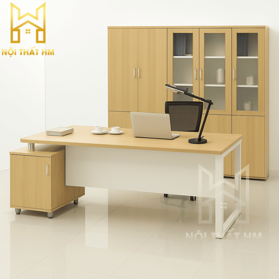 Với tủ phụ dài bằng bàn chính (160cm), bạn có một diện tích cực lớn để bố trí máy tính, máy in, và các tập hồ sơ quan trọng. Thiết kế chữ L giúp nhà lãnh đạo dễ dàng bao quát công việc và xoay sở linh hoạt giữa các nhiệm vụ khác nhau.