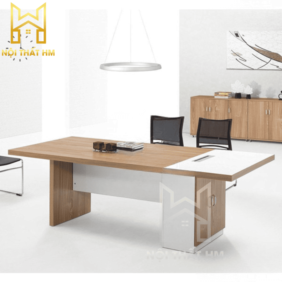 Mẫu BH11 là giải pháp hoàn hảo cho những phòng họp có diện tích vừa phải nhưng cần lưu trữ nhiều hồ sơ, catalogue hoặc thiết bị kỹ thuật. Thay vì sử dụng chân gỗ thông thường, BH11 tận dụng phần gầm bàn để làm hệ hộc tủ, giúp phòng họp luôn gọn gàng và chuyên nghiệp.