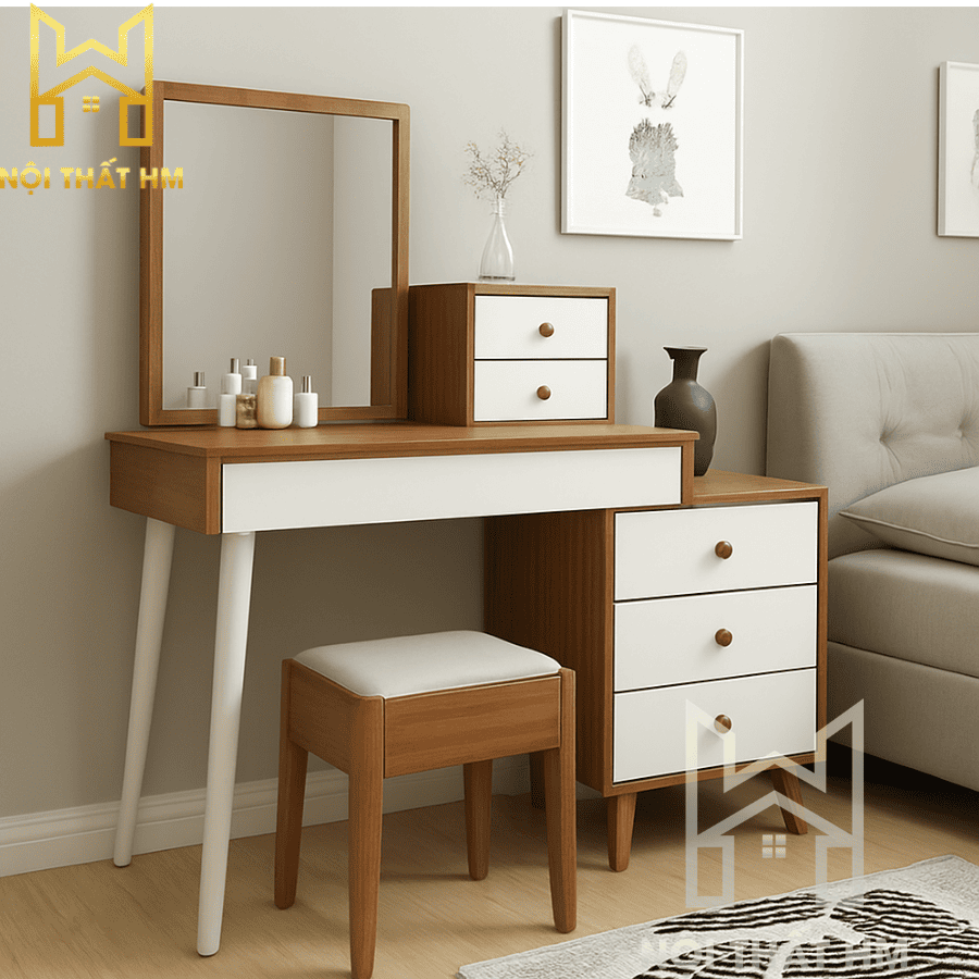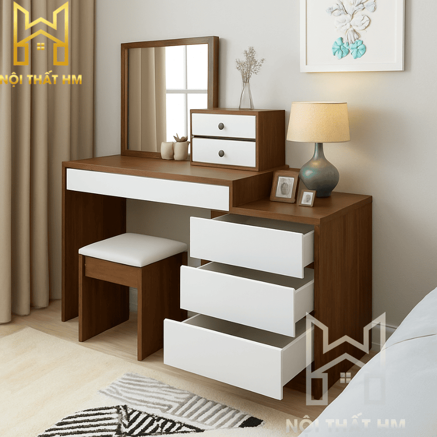 Mẫu BTD05 được thiết kế dành cho những quý cô yêu thích sự gọn gàng. Điểm nhấn của mẫu này là sự kết hợp giữa mặt bàn rộng 90cm và hệ tủ hộc ngăn kéo cỡ lớn, giúp bạn giấu kín mọi món đồ lặt vặt, trả lại không gian thoáng đãng cho phòng ngủ.