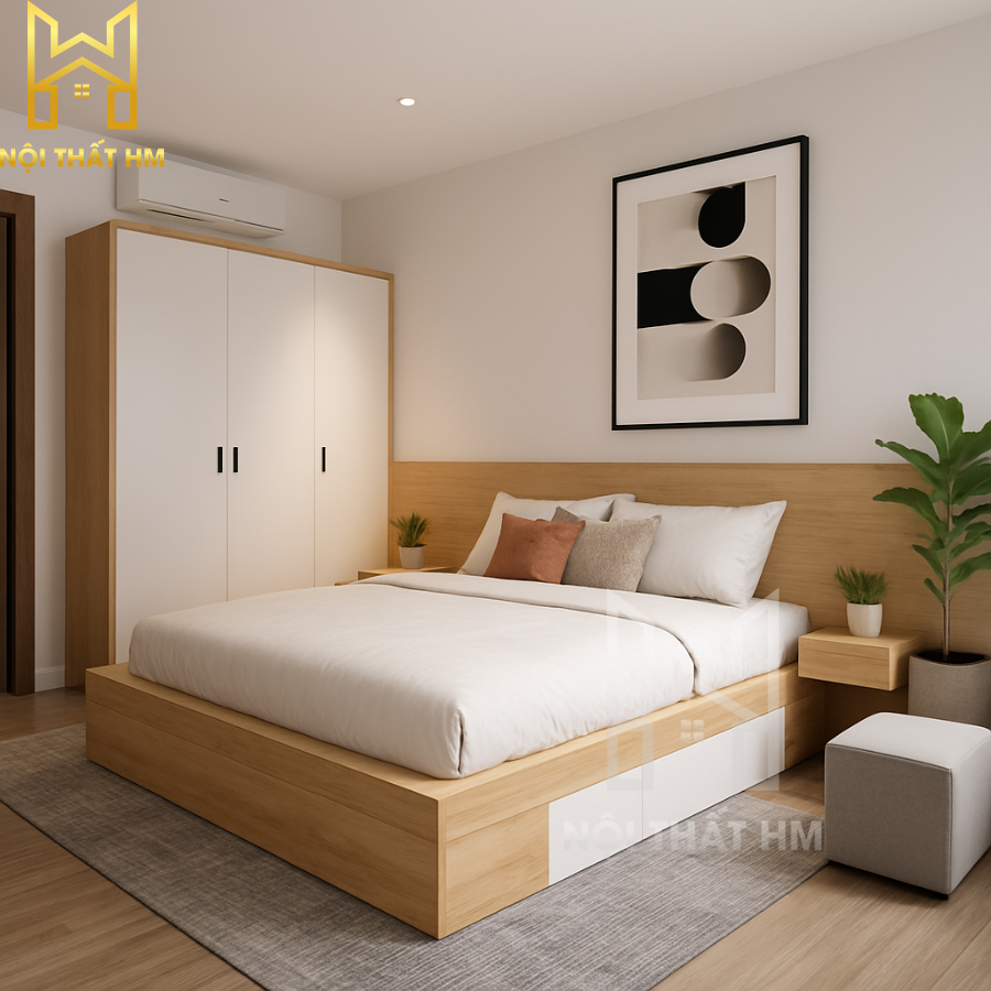 Giường ngủ ngăn kéo: Tích hợp hộc chứa đồ dưới gầm giường, giải quyết triệt để bài toán lưu trữ chăn ga, gối đệm dự phòng.