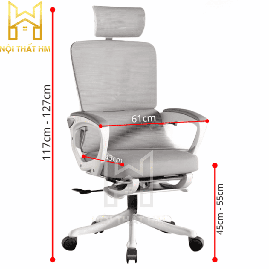 Cao tổng thể: 117 cm – 127 cm (Tựa đầu tùy chỉnh nâng thêm 7 cm).