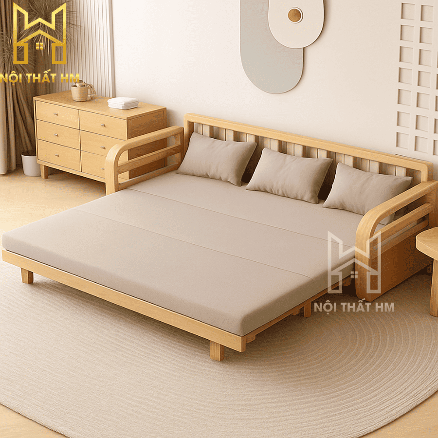 Kiểu dáng: Sofa văng gỗ thông minh, tích hợp cơ chế kéo lật linh hoạt.