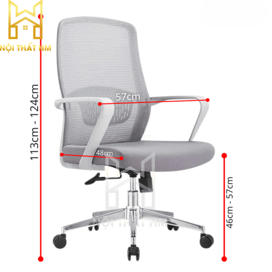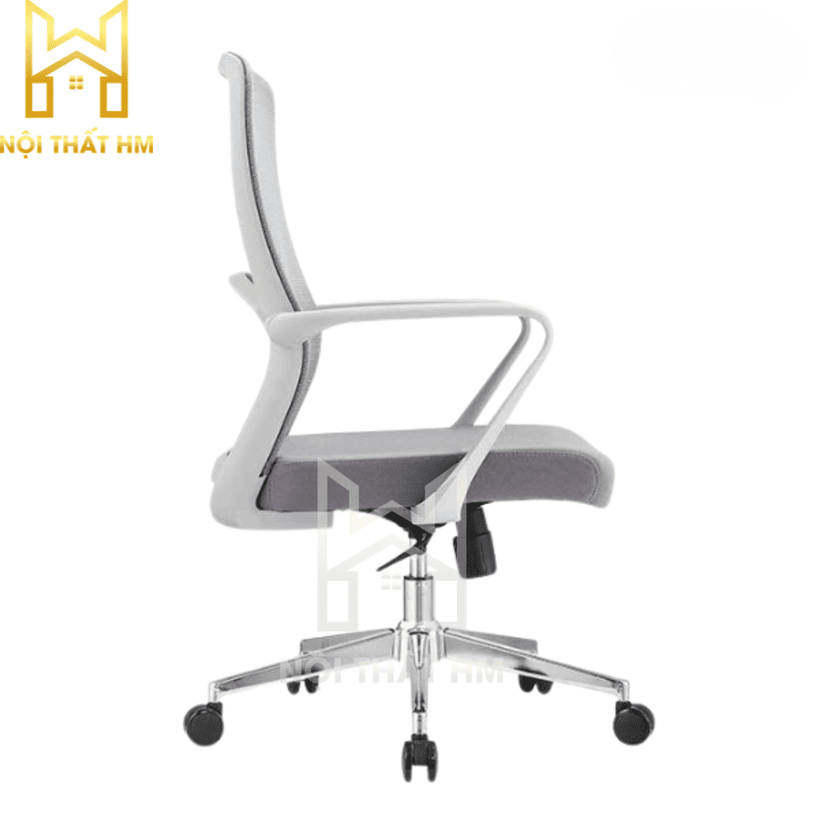 Lưng ghế: Lưới cường lực màu ghi, thoáng mát, không tích nhiệt, tạo cảm giác nhẹ nhàng cho không gian.