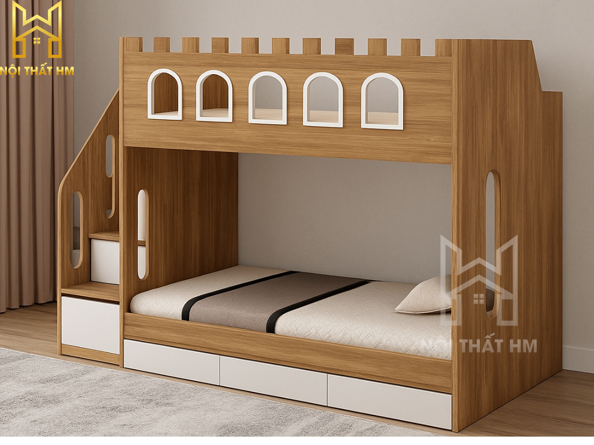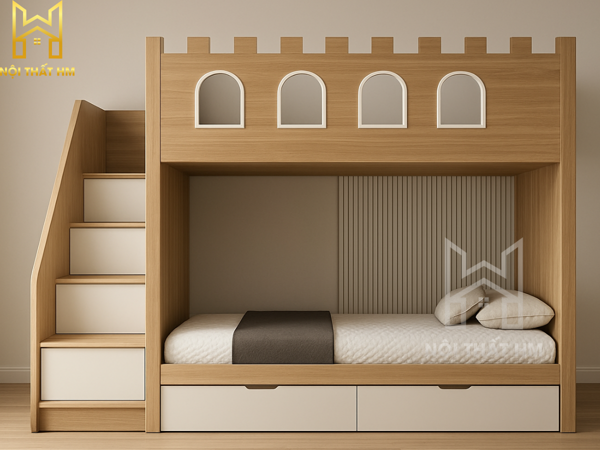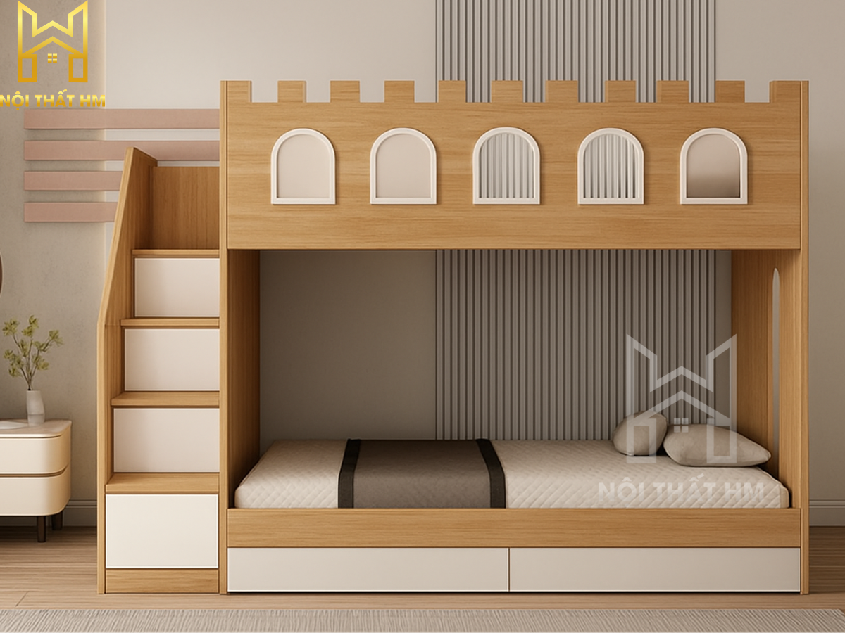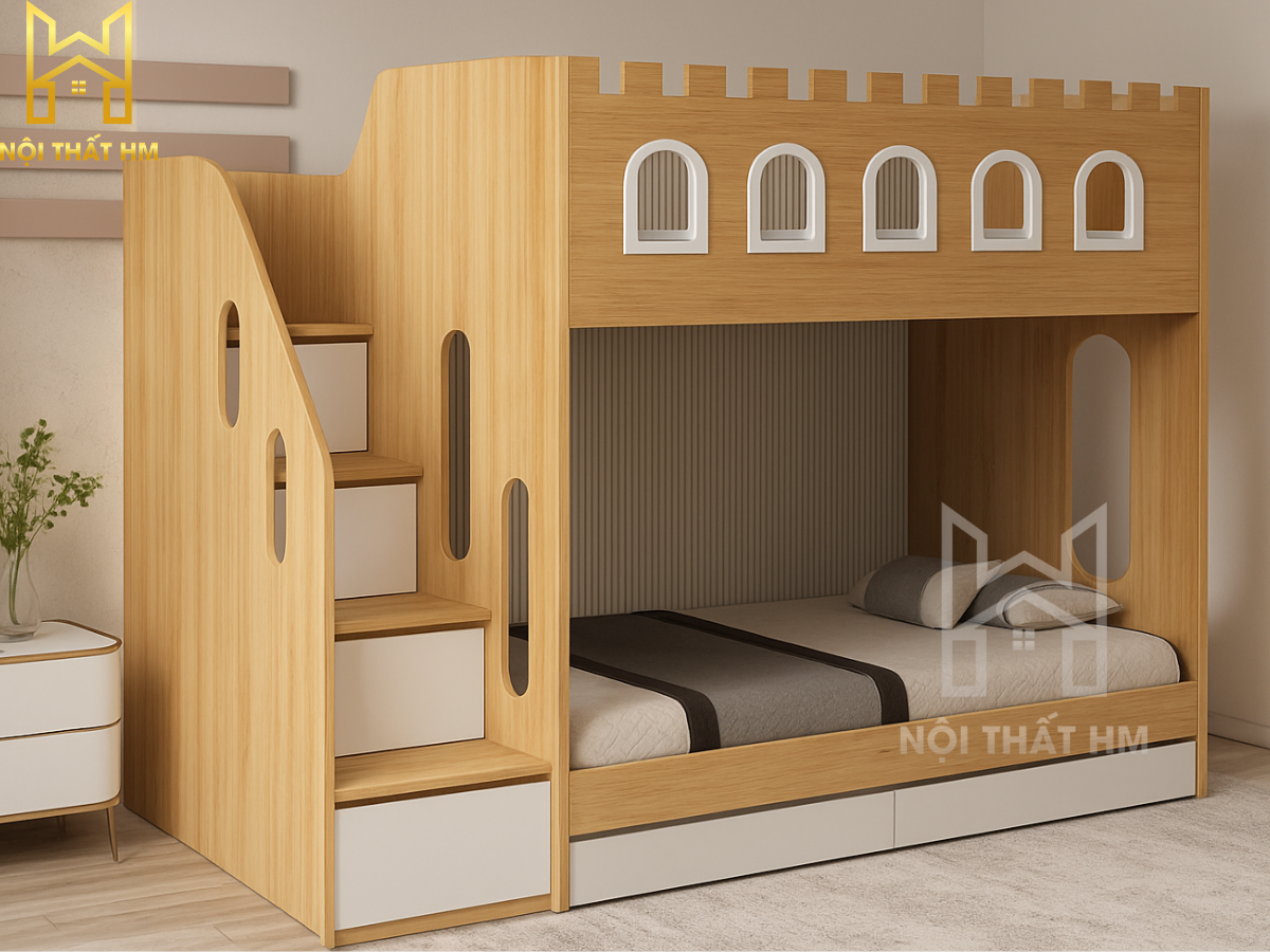 Mọi đứa trẻ đều từng mơ ước trở thành những nàng công chúa hay hoàng tử trong vương quốc của riêng mình. Tại Nội thất HM, chúng tôi hiện thực hóa giấc mơ đó với mẫu Giường tầng hình lâu đài GT13. Không chỉ là một món nội thất, đây là không gian sáng tạo kỳ diệu, nơi nuôi dưỡng tâm hồn và mang lại những giấc ngủ ngọt ngào cho bé yêu.