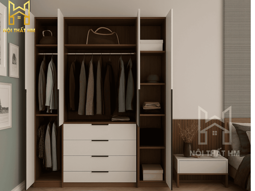 Cấu tạo: 3 khoang treo y phục, hệ ngăn để đồ gấp và 4 ngăn kéo tiện dụng.