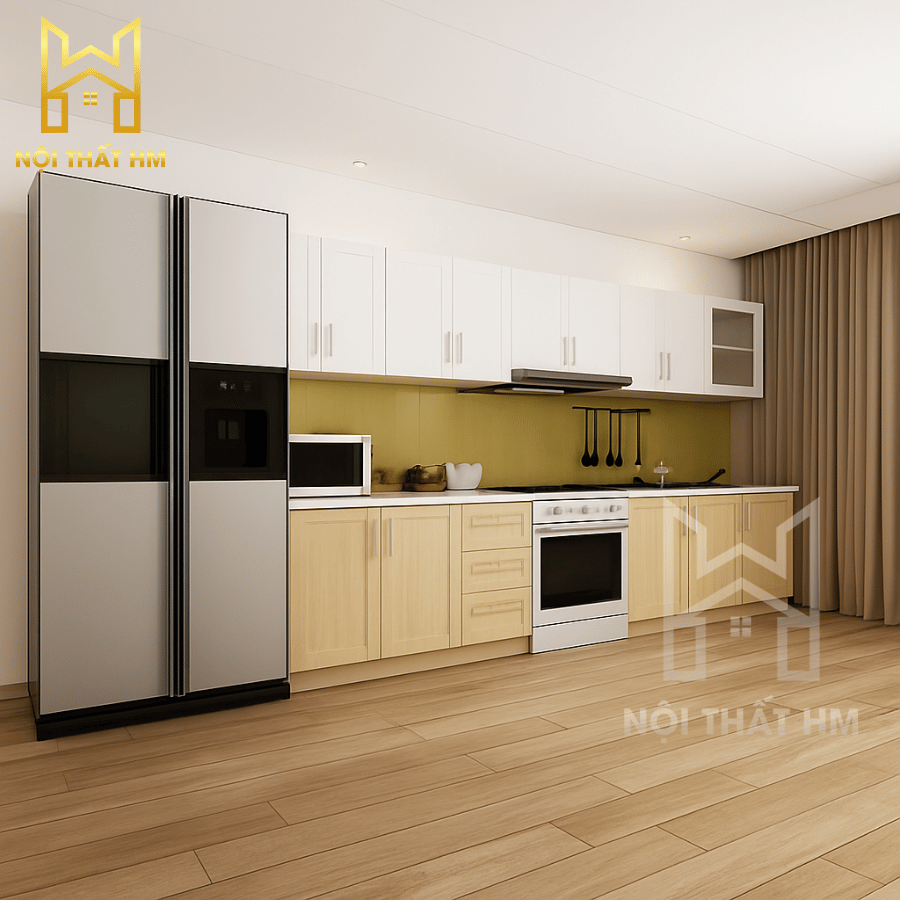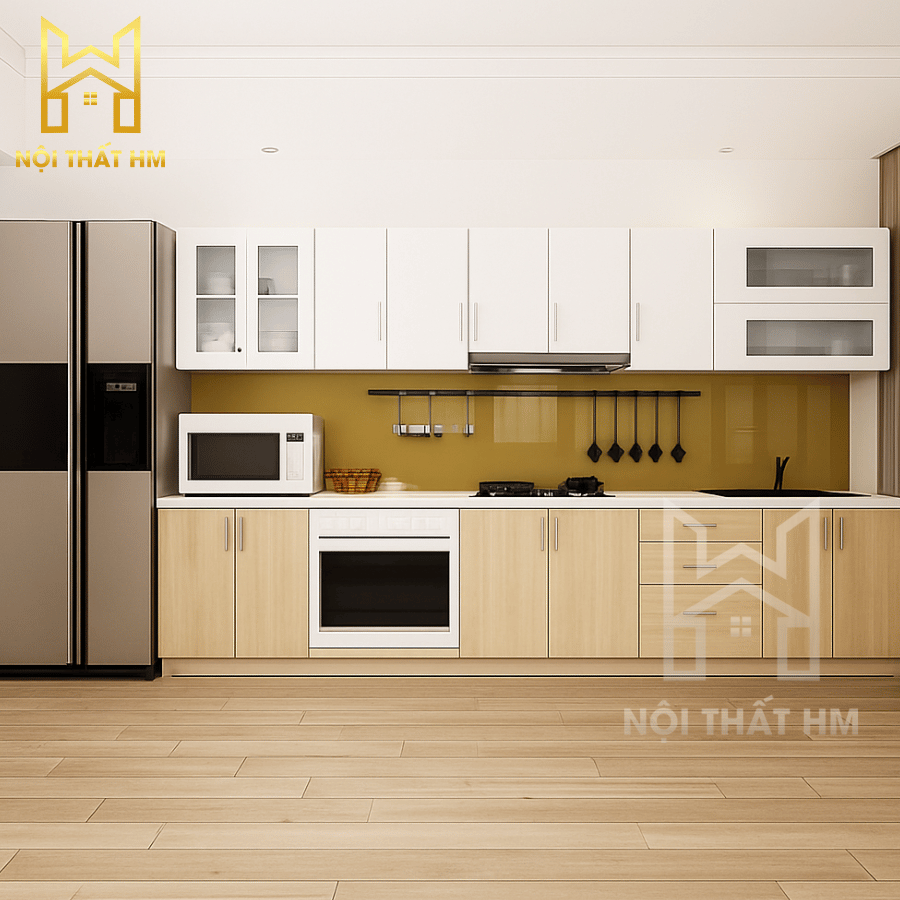 Mẫu TB03 là sự kết hợp hoàn mỹ giữa tông màu trắng tinh khôi và vân gỗ sáng tự nhiên. Thiết kế dạng chữ I (tủ thẳng) giúp tập trung toàn bộ công năng nấu nướng trên một đường thẳng, cực kỳ phù hợp cho các căn hộ chung cư mini hoặc nhà phố có bề ngang hẹp.